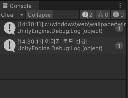 배경화면을 이미지로 설정할 시, 이미지 로드 성공과 함께 유니티에 뜨며, 사진의 경로도 나타나게 됩니다.