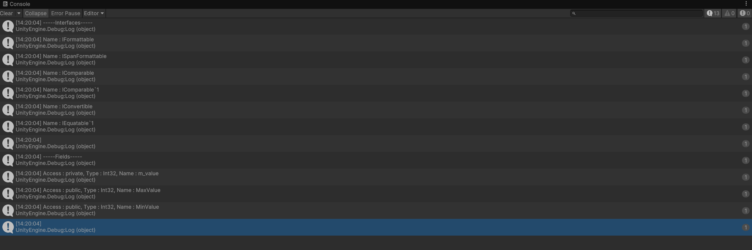 Debug.Log($"Access : {accessLevel}, Type : {field.FieldType.Name}, Name : {field.Name}");