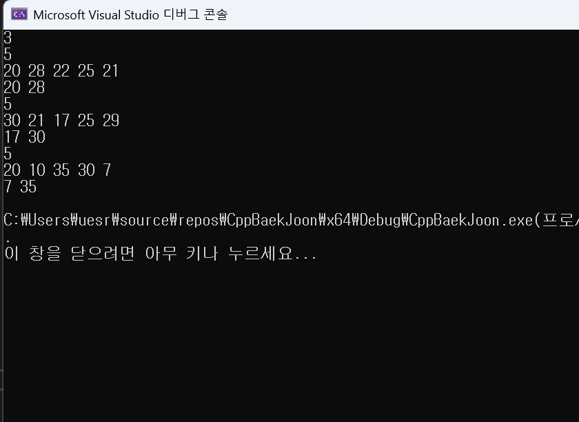 현재 테스트 케이스에서 찾은 최소값 minVal과 최대값 maxVal을 공백으로 구분하여 출력하고,