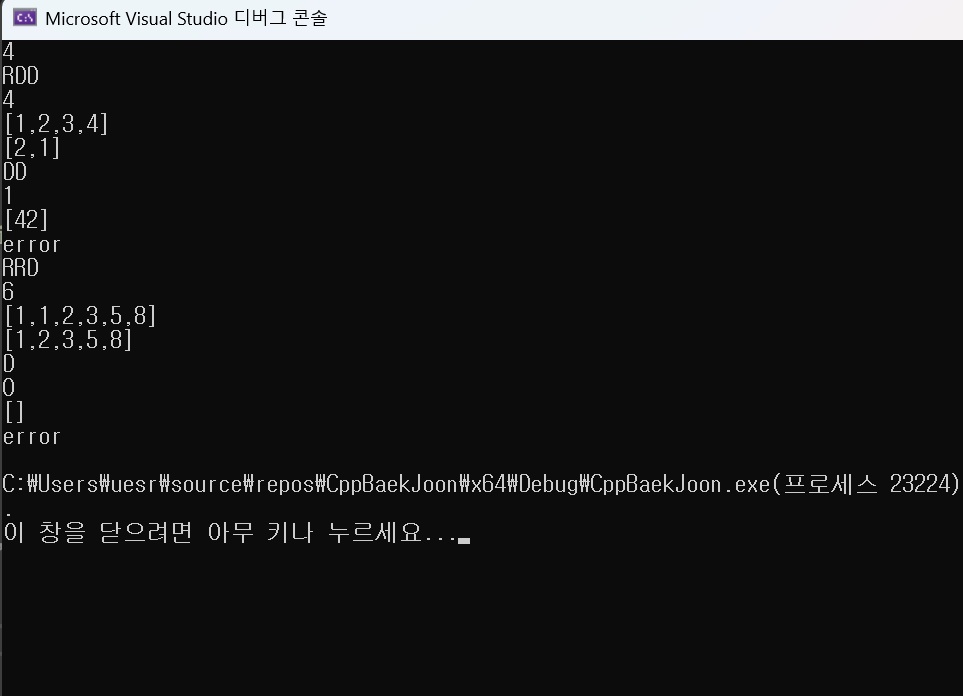 if (deq.empty()): 제거하기 전에 데크가 비어있는지 확인합니다. 비어있으면 에러이므로 isError를 true로 설정하고 break로 명령 수행 루프를 중단합니다.