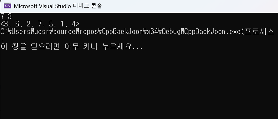 cout << que.front() << '>';: 큐에 마지막으로 남은 사람의 번호를 출력하고, 결과 순열의 끝을 알리는 '>' 문자를 출력합니다.