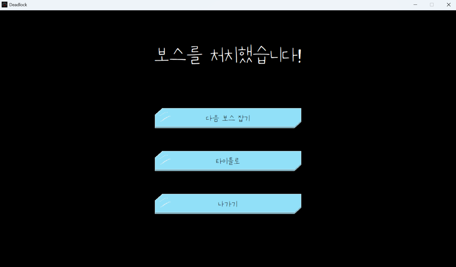 보스를 다시 선택해서 게임을 진행할 수도 있고, 타이틀로 돌아가거나 게임을 종료할 수 있습니다.