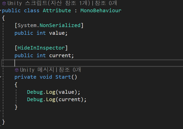 public으로 선언된 변수를 inspector에서 숨기고 싶을 때 사용합니다.